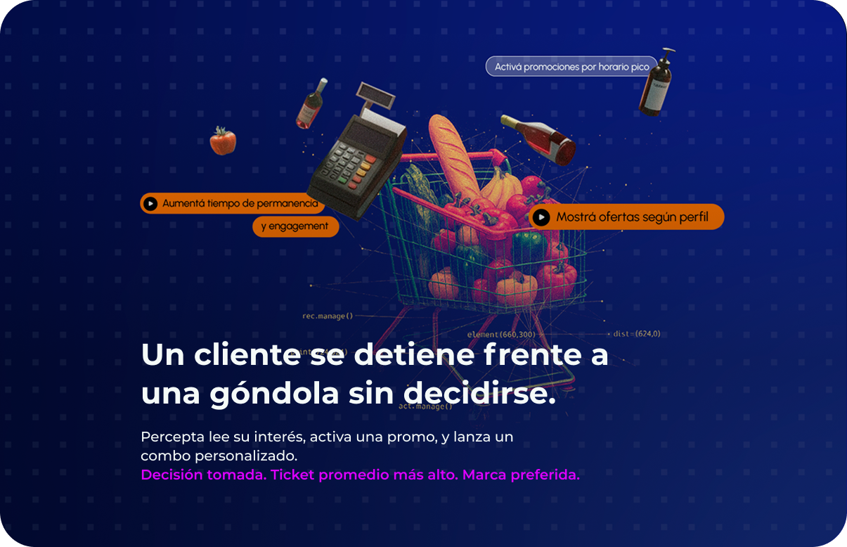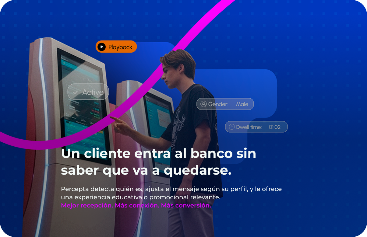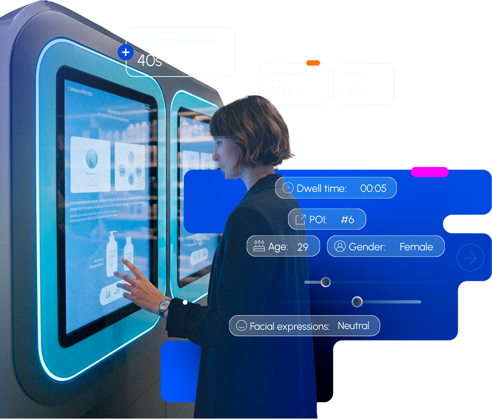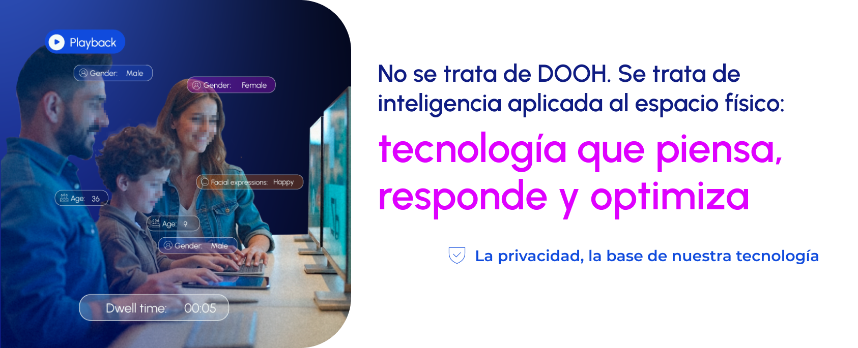 Nuestra tecnología convierte cualquier espacio físico en un medio inteligente: detecta quién está, cómo reacciona, cuánto tiempo se queda y adapta en tiempo real el contenido para maximizar impacto, ventas y data. ¿Lo mejor? Las métricas.