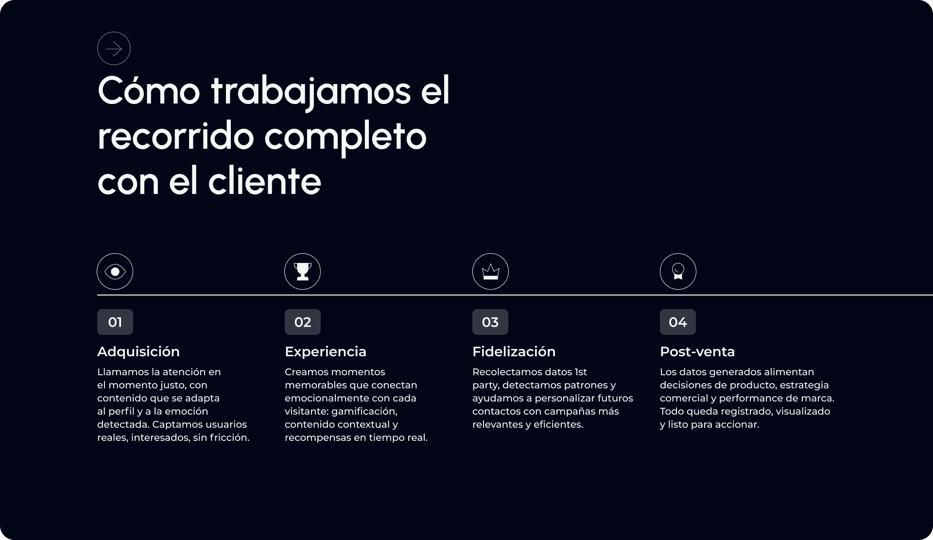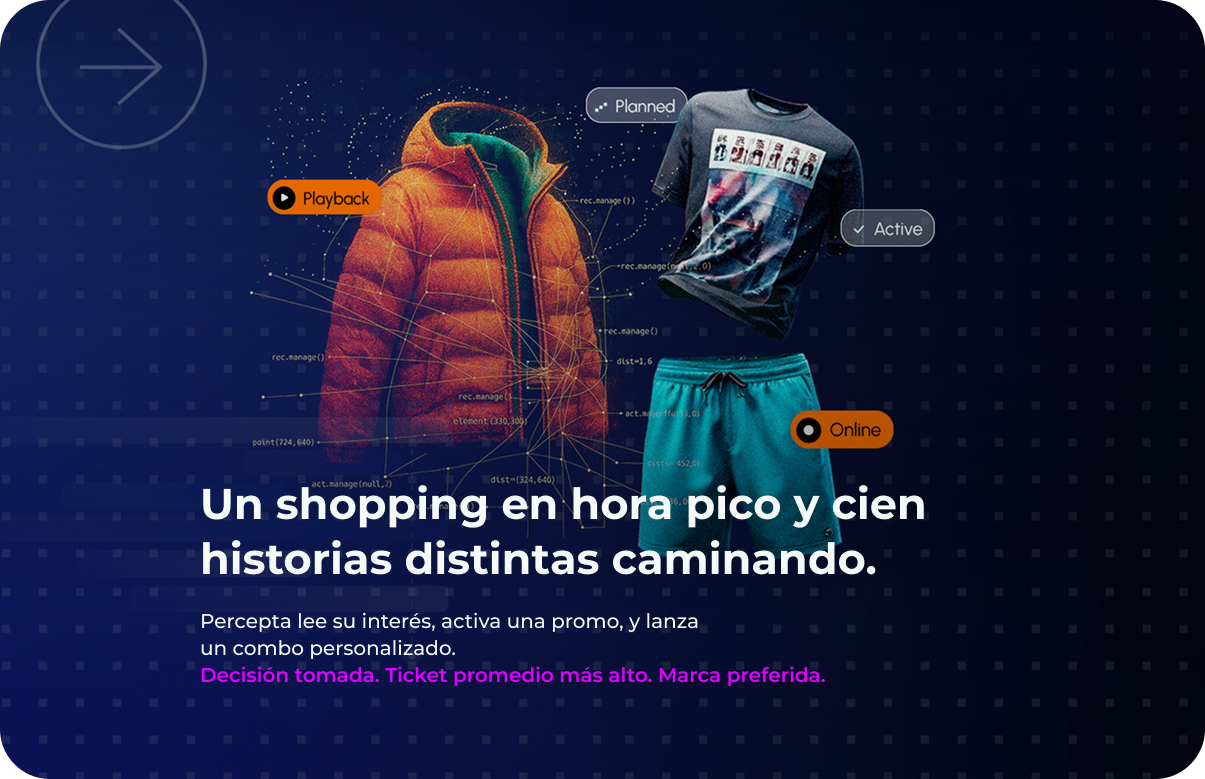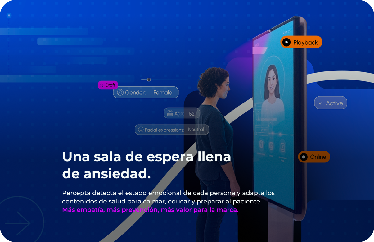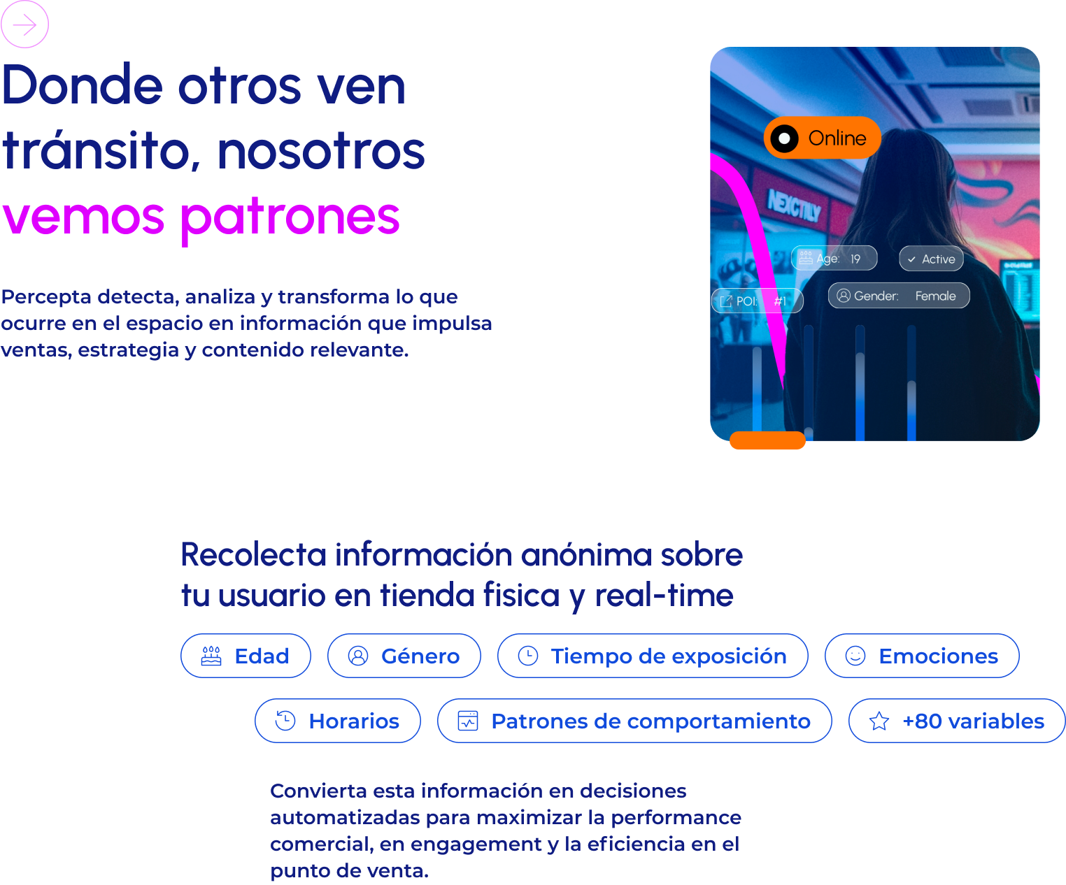 Nuestra tecnología convierte cualquier espacio físico en un medio inteligente: detecta quién está, cómo reacciona, cuánto tiempo se queda y adapta en tiempo real el contenido para maximizar impacto, ventas y data. ¿Lo mejor? Las métricas.
