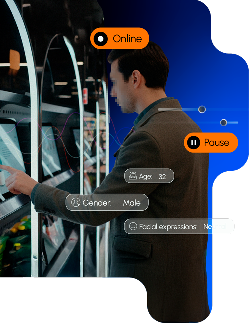 Monitoreo de interacción en tiempo real: Detección anónima de personas por cámara: edad aproximada, género, emociones faciales, tiempo de permanencia, cantidad de personas frente al dispositivo.